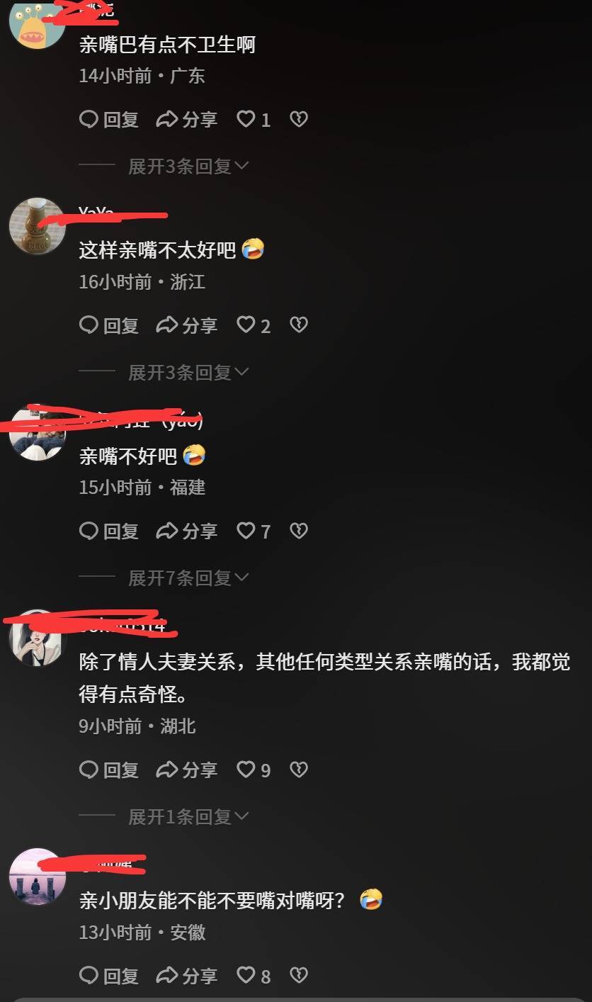 不少网友看到老人和小孩嘴对嘴亲吻,纷纷表示:“嘴对嘴太不卫生了”“大人嘴里有细菌,会传染给小孩”“再亲也不能嘴对嘴,对孩子不好”。