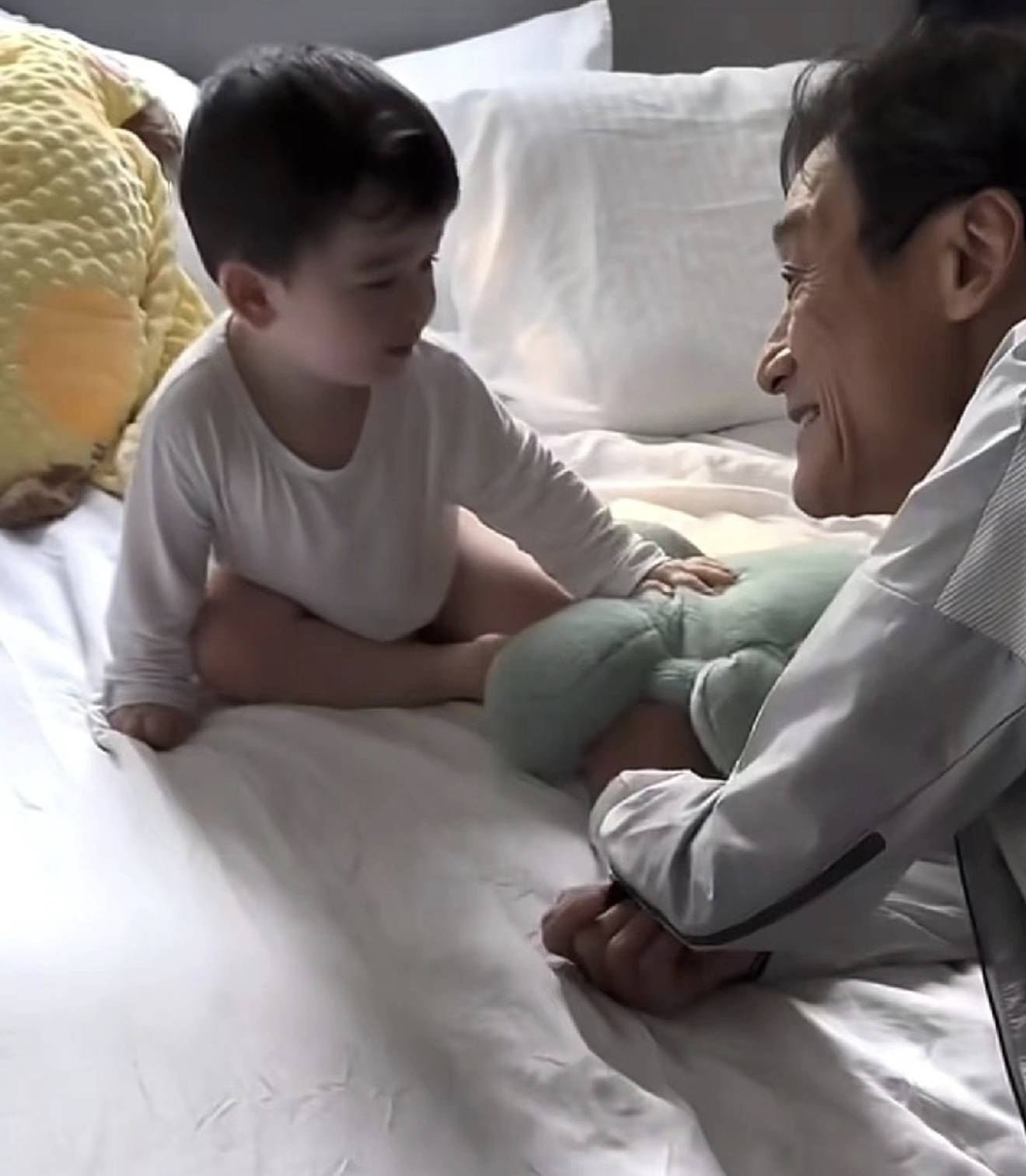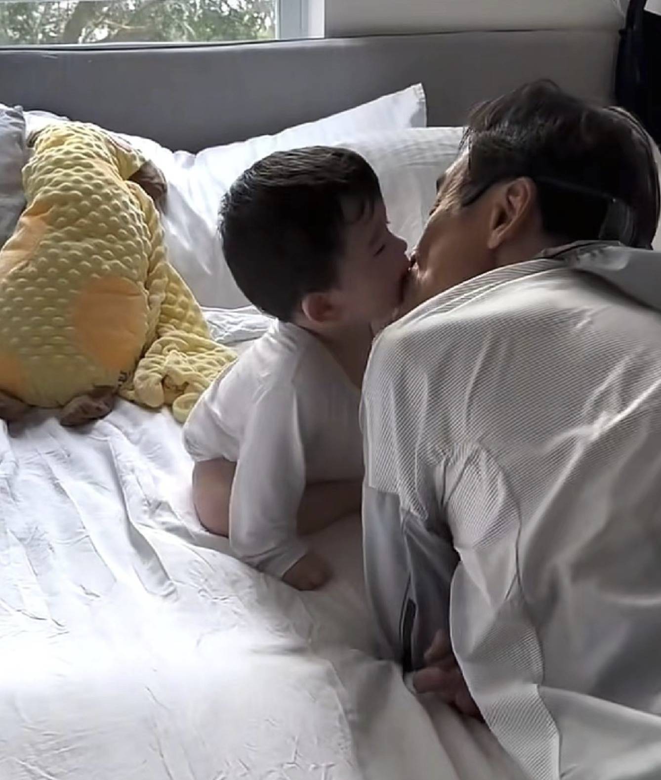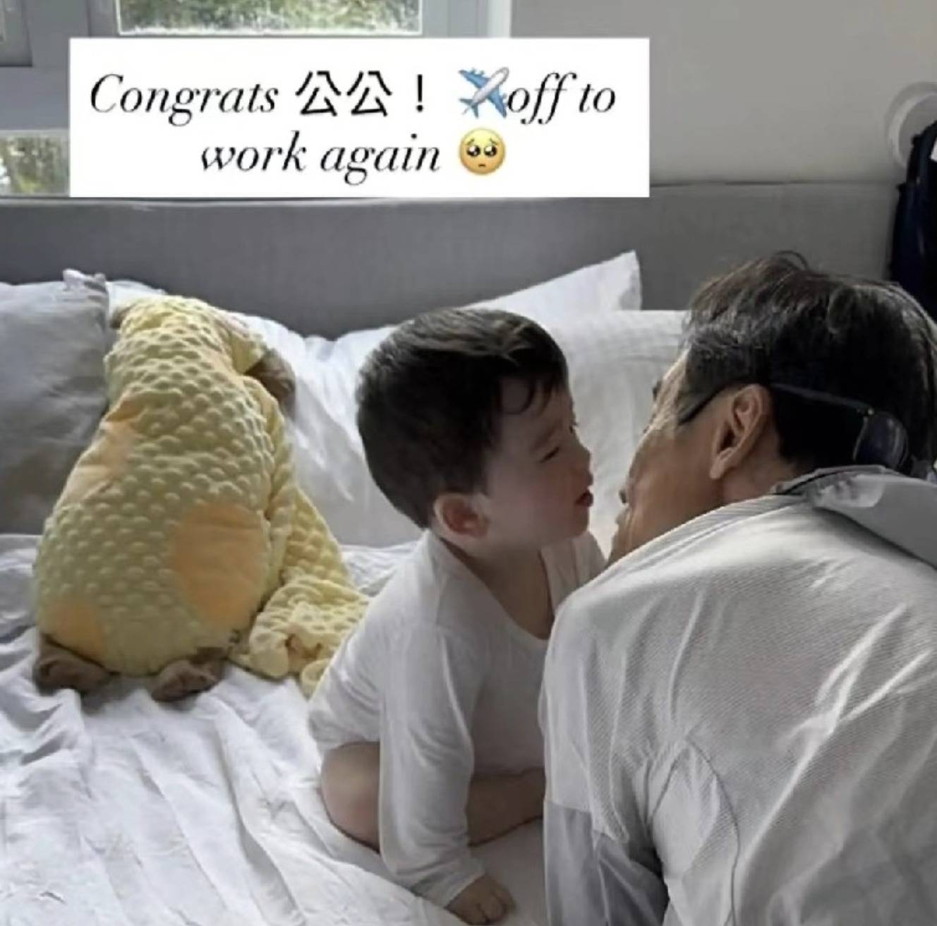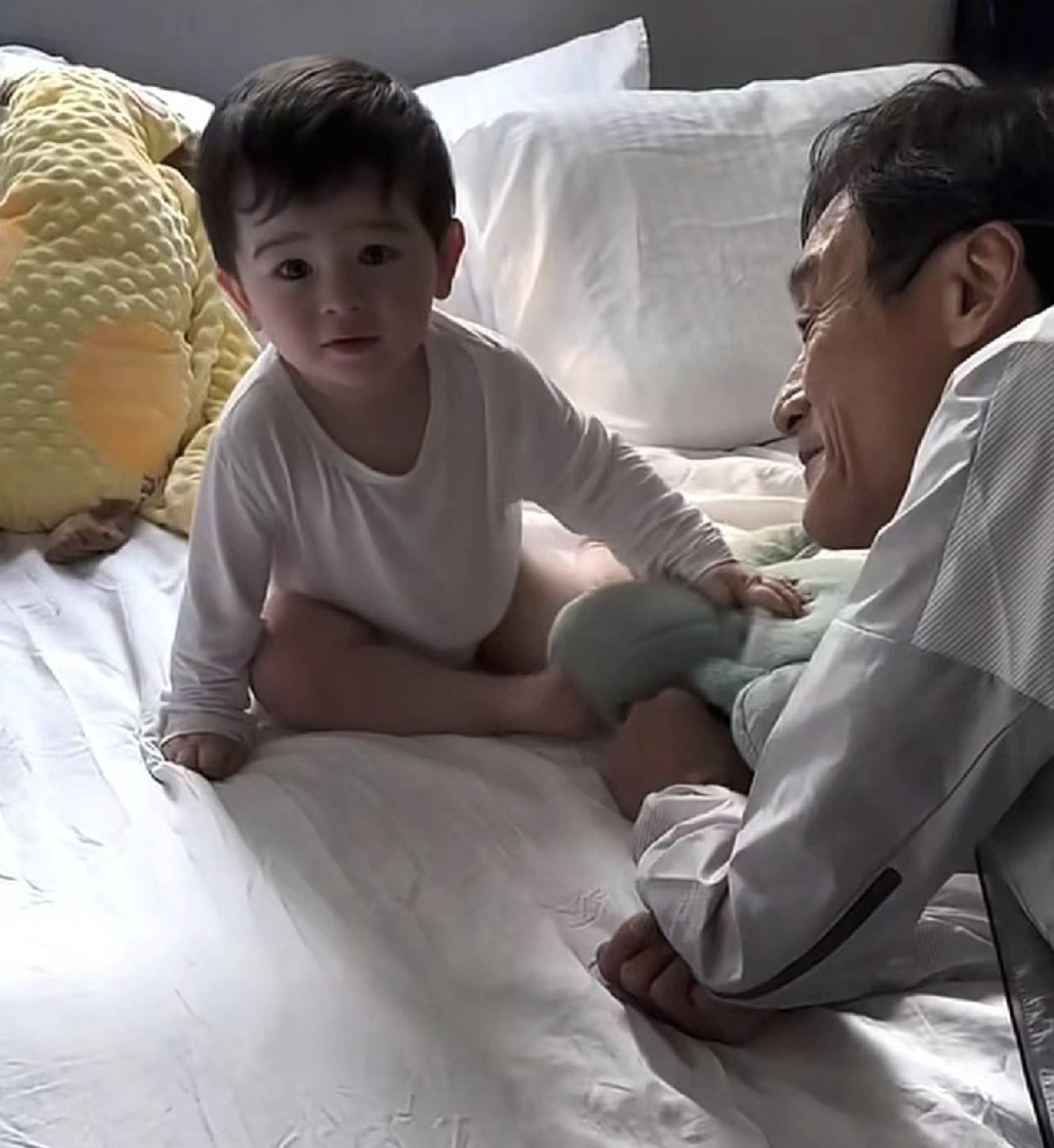 梁家辉看着小孙孙的眼神,温柔得能滴出水来,连嘴角的皱纹里,都藏着笑意。
